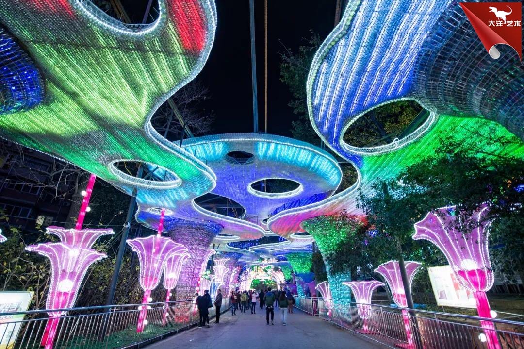 壯觀。置身其間,仿若進(jìn)入璀璨晶瑩的世界。燈組長(zhǎng)46米,距地面5米高的彩云,錯(cuò)落交叉布局,覆蓋10米寬的通道。僅制作頂部