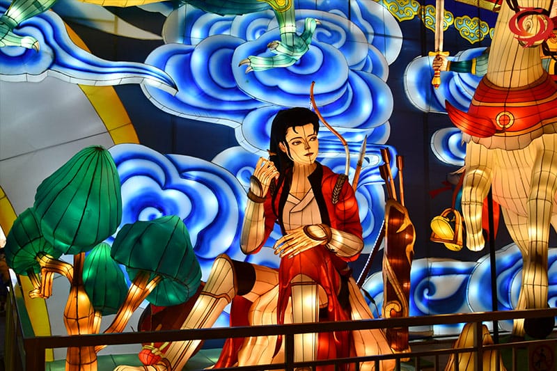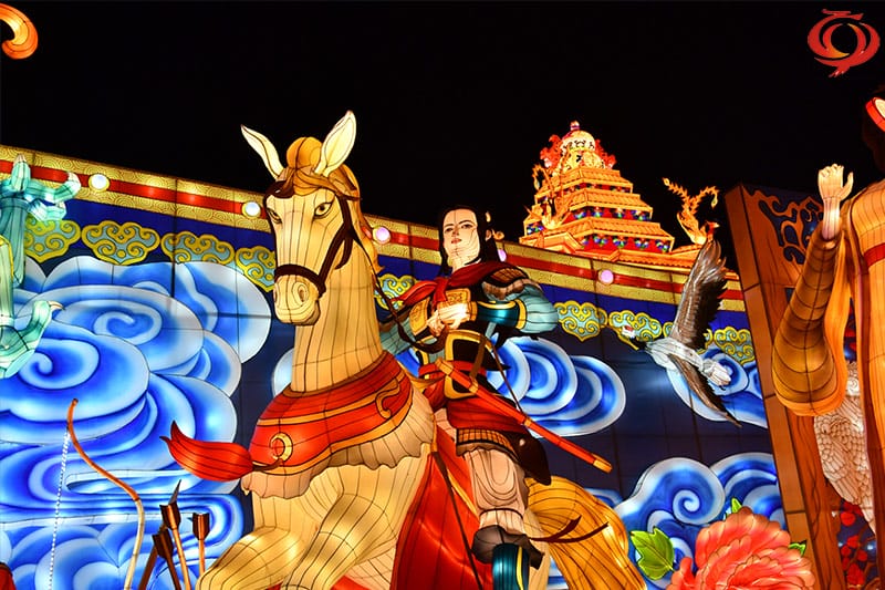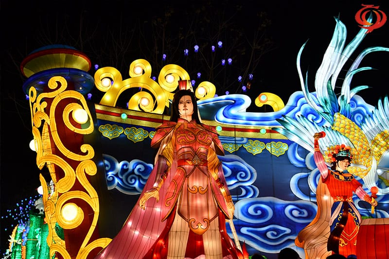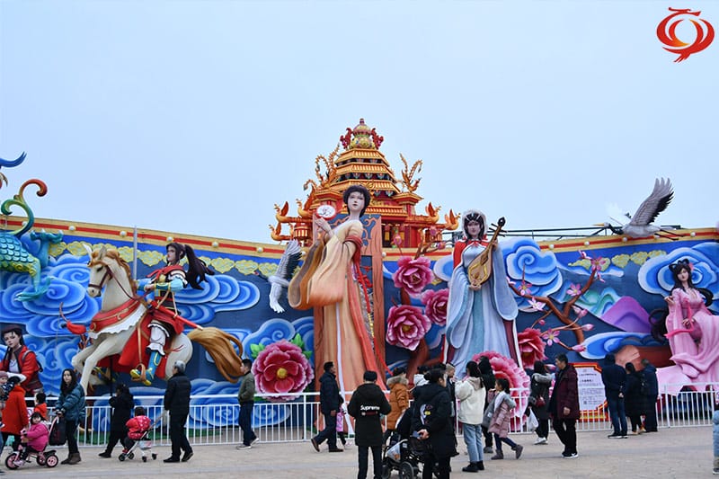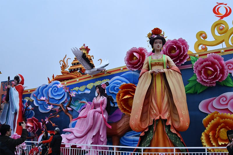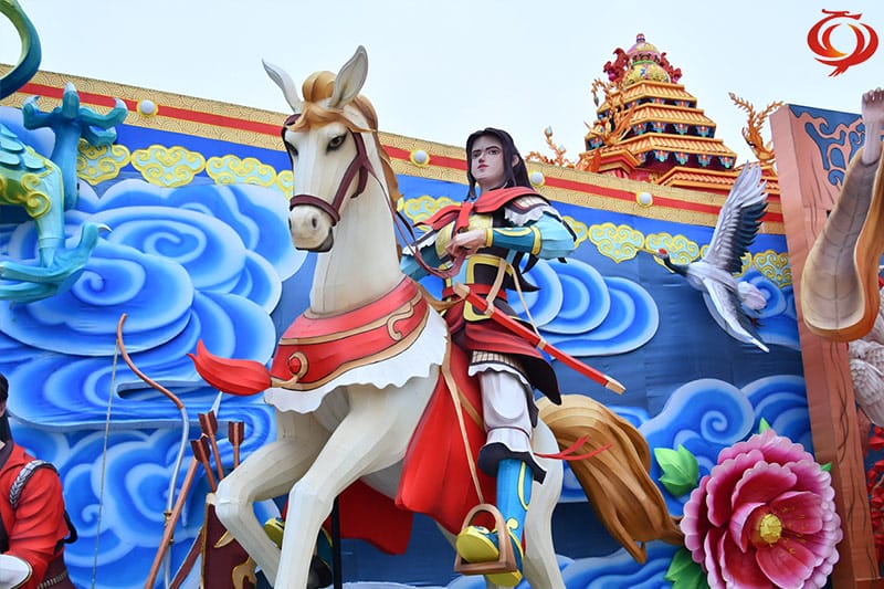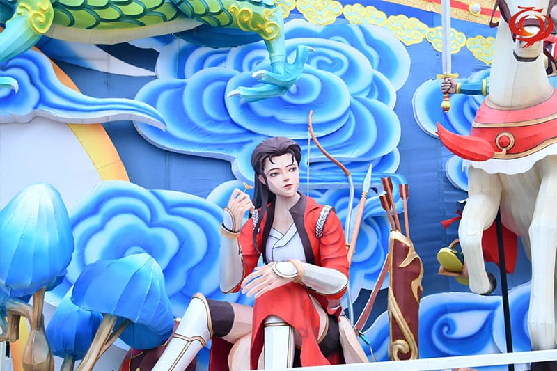 燈組是以我國古代歷史上的“四大美女”和“四大女將”為創(chuàng)意原型,古代四大美女分別是西施,王昭君、貂蟬楊玉環(huán),古代四大女將分別是花木蘭、穆桂英、秦良玉、馮婉真。燈組用一幅巨大的畫卷將這些秋絕色的美女串在一起,各展風(fēng)姿風(fēng)采,展示了中國古代女性各自不同的獨特美麗。燈組鋼架結(jié)構(gòu),絲架造型分色裱糊,首次用藝術(shù)夸張的手法塑造了一個個高大而漂亮豐滿而風(fēng)韻的美女,飄逸的服飾、精致的色彩,優(yōu)雅的動感讓人仰望慕之
