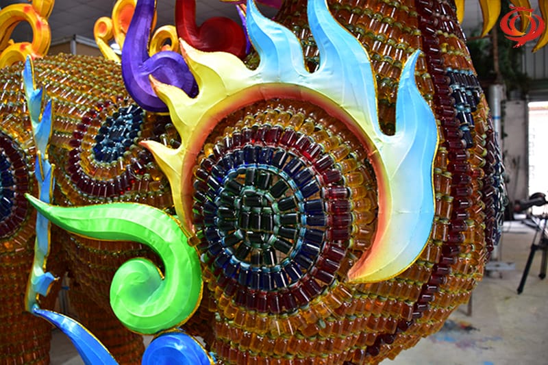 進(jìn)入20世紀(jì)80年代,藥瓶燈選取的材料越來越多、造型越來越復(fù)雜、體量也越來越大,之前的做法是將一個(gè)個(gè)藥瓶粘接起來,這樣的技術(shù)已不能適應(yīng)觀眾的審美需要,于是,鋼架支撐,圓鋼與絲架造型,絲網(wǎng)襯底,用細(xì)鐵絲捆扎藥瓶附著其上的技術(shù)應(yīng)運(yùn)而生。工藝技術(shù)的進(jìn)步極大地豐富了藥瓶燈的表現(xiàn)カ,觀賞性也得以大幅提升,成為自貢燈會(huì)標(biāo)志性特殊材質(zhì)彩燈之一。在20世紀(jì)90年代的自貢燈會(huì)中,又將機(jī)械傳動(dòng)技術(shù)運(yùn)用其間,實(shí)現(xiàn)了旋轉(zhuǎn)等簡易動(dòng)態(tài)。